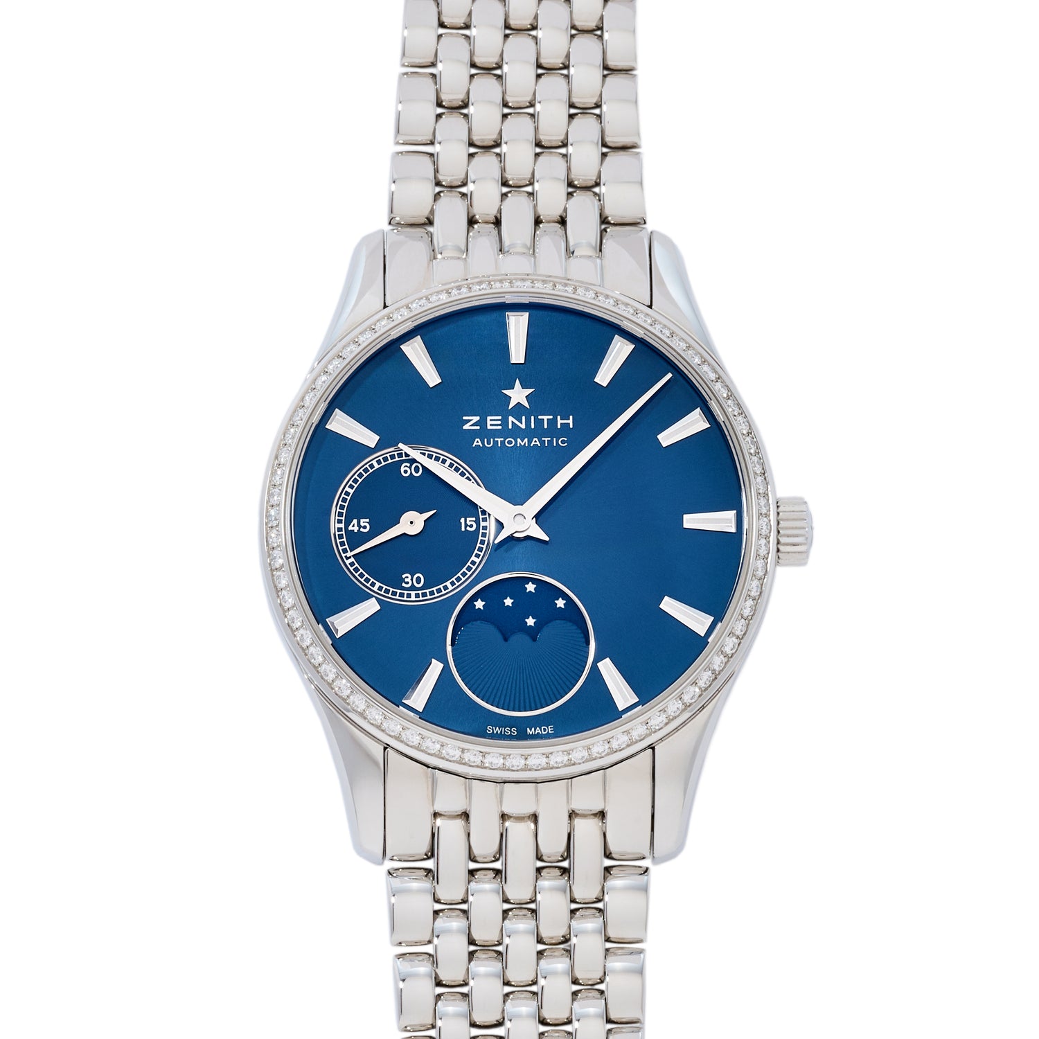 This piece comes from the latter manufacture. It features a 33mm stainless steel round case with an awesome, factory diamond set bezel, steel crown and a blue dial complemented by applied indices and a matching petite 'dauphine' handset. The crowning jewel of this piece, however, is its moonphase and slender profile. The left side of the dial has an incredible subsidiary seconds dial. The whimsical distribution of the complications allows this piece to have a truly lovely presence on the wrist.