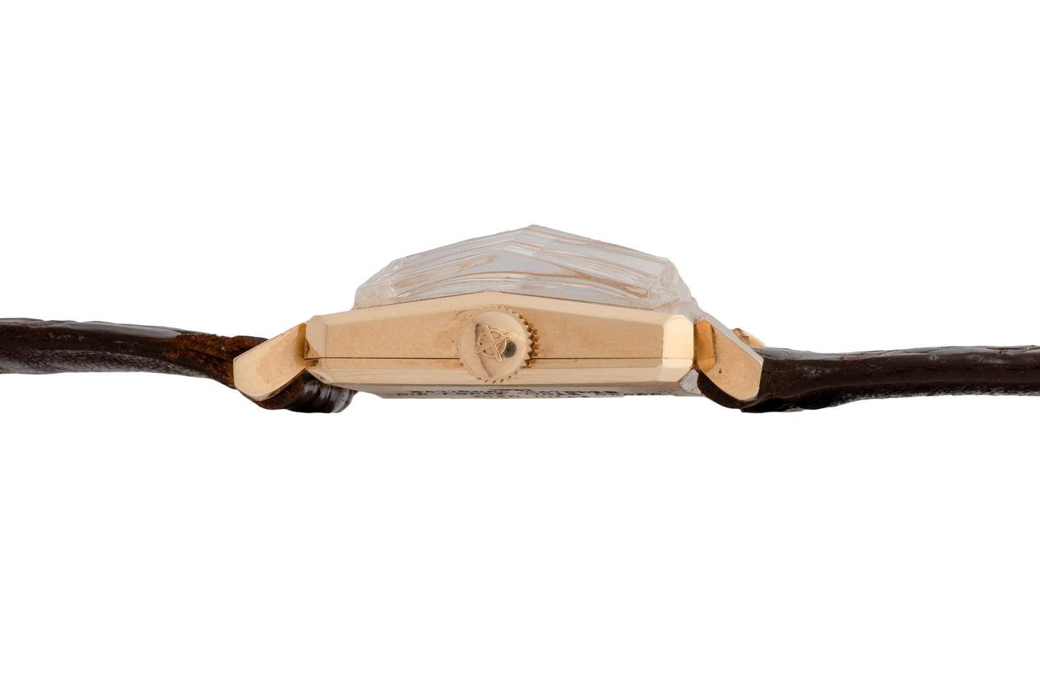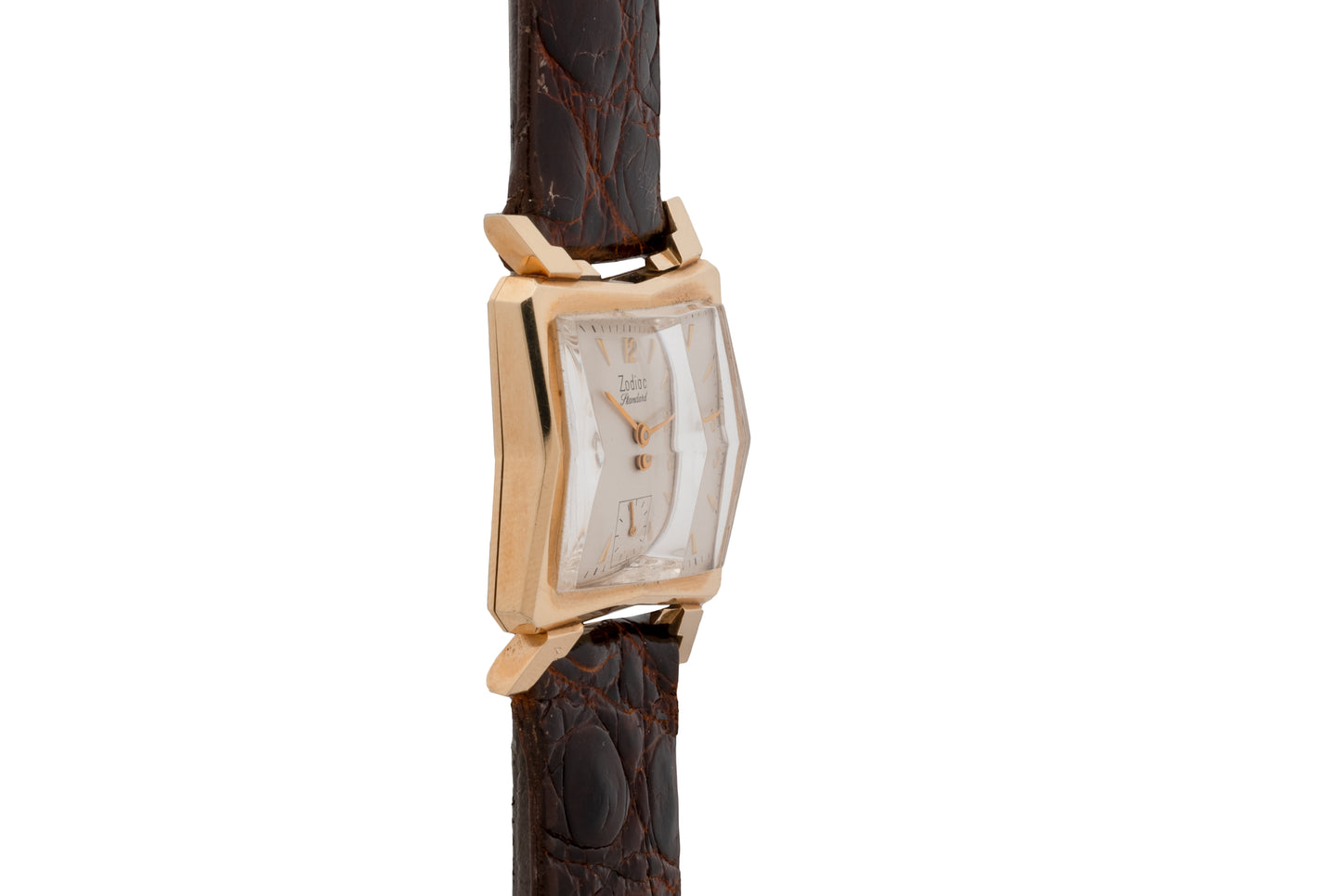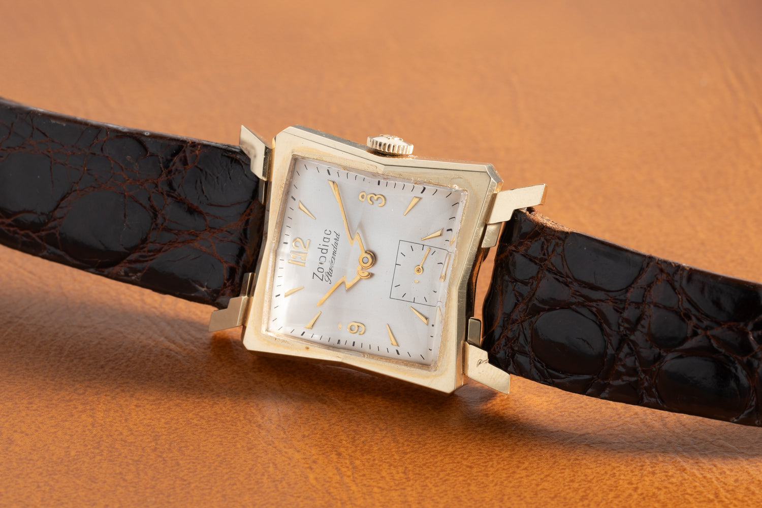 Dating to the early 1960s, this piece features a stylized 26mm 14K yellow gold case with ‘fancy’ lugs, a signed crown, and a fantastic, faceted acrylic crystal. The white dial has patinated to a delightful cream tone and features applied, ‘dagger,’ gold indices; a constant seconds subsidiary register at 6 o’clock; and a matching gold handset.