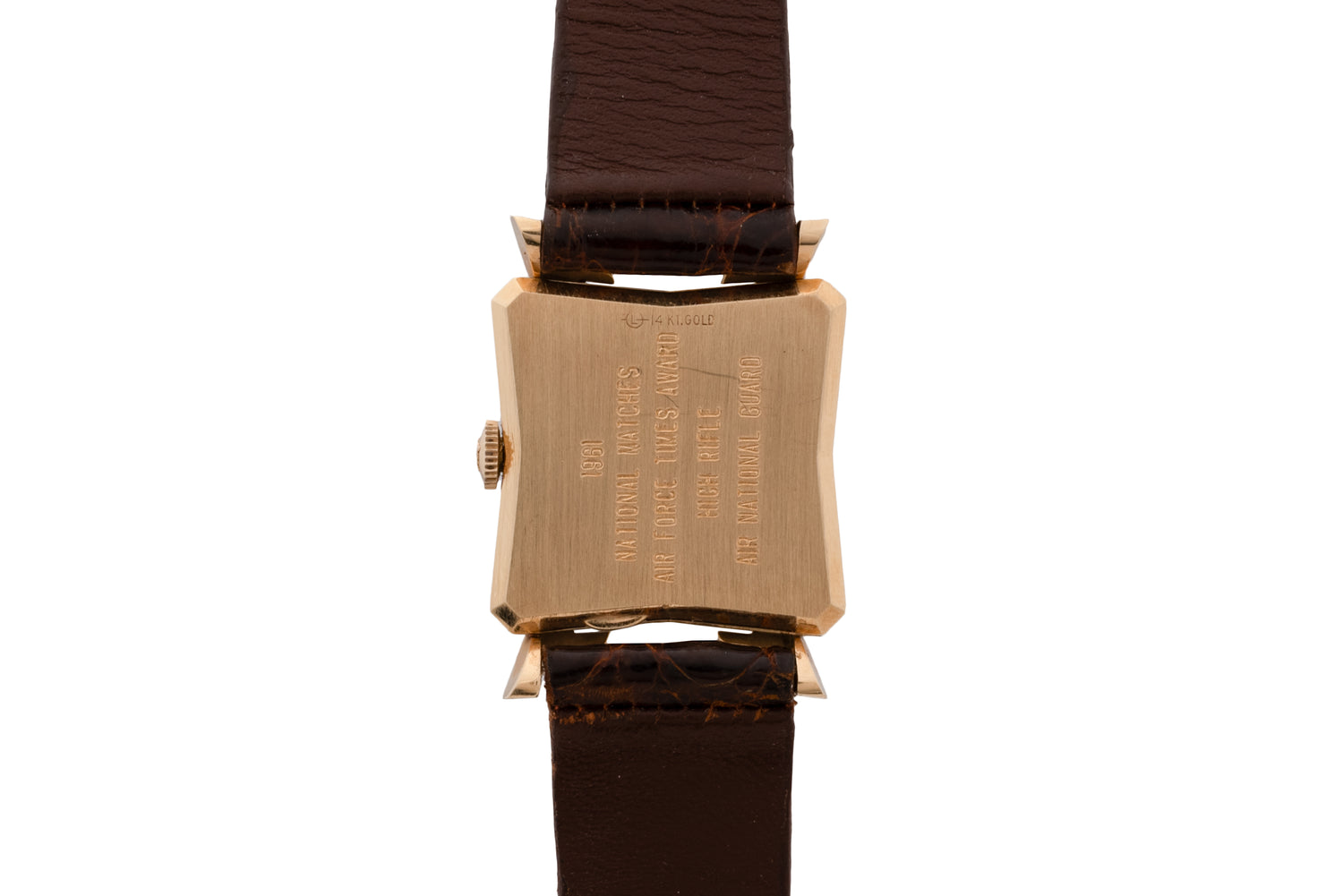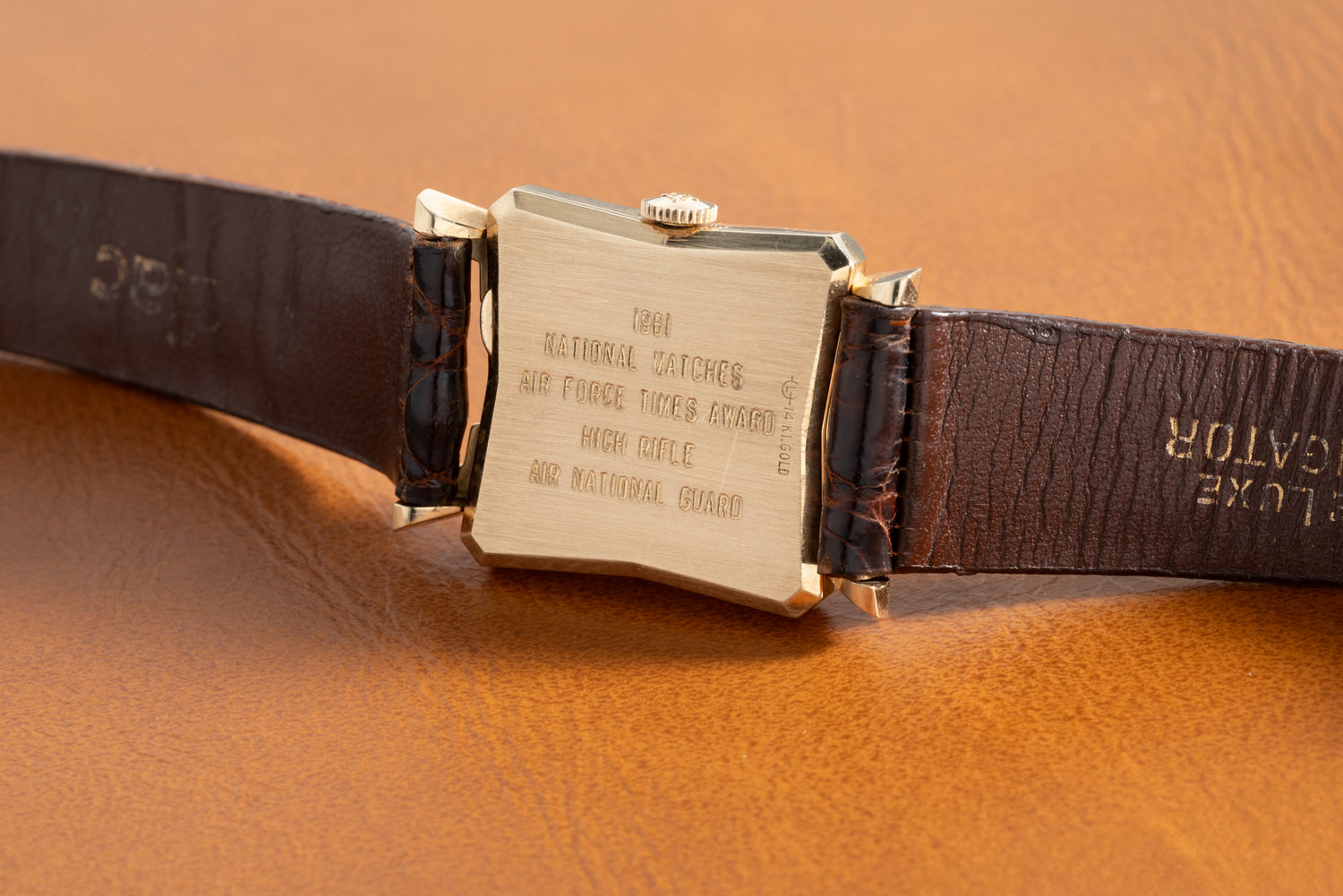 The caseback reveals that this piece was presented to the Air Force Times Award for High Rifle during the 1961 National Matches celebrating exceptional marksmanship.